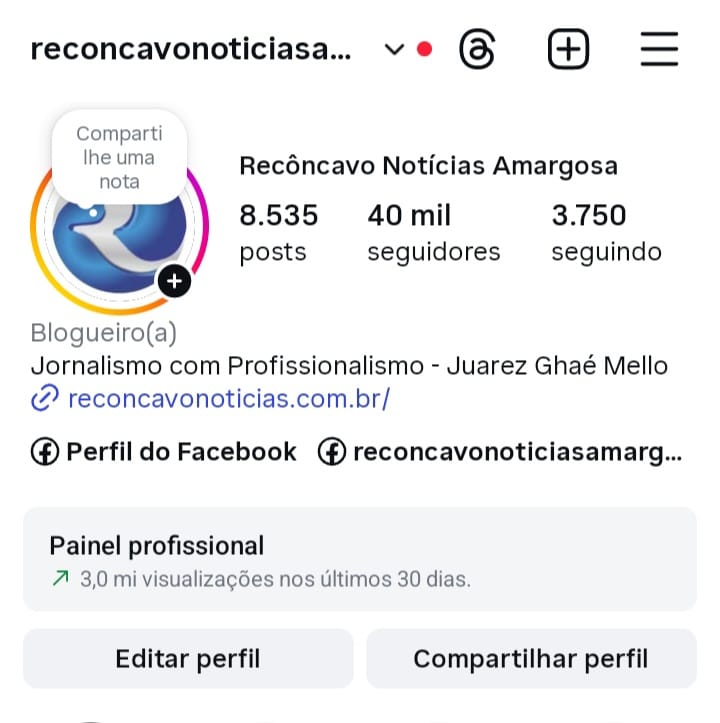 O site Recôncavo Notícias chegou 40 mil seguidores orgânicos no Instagram e alcançou a marca de 3 milhões de visualizações nos últimos 30 dias
