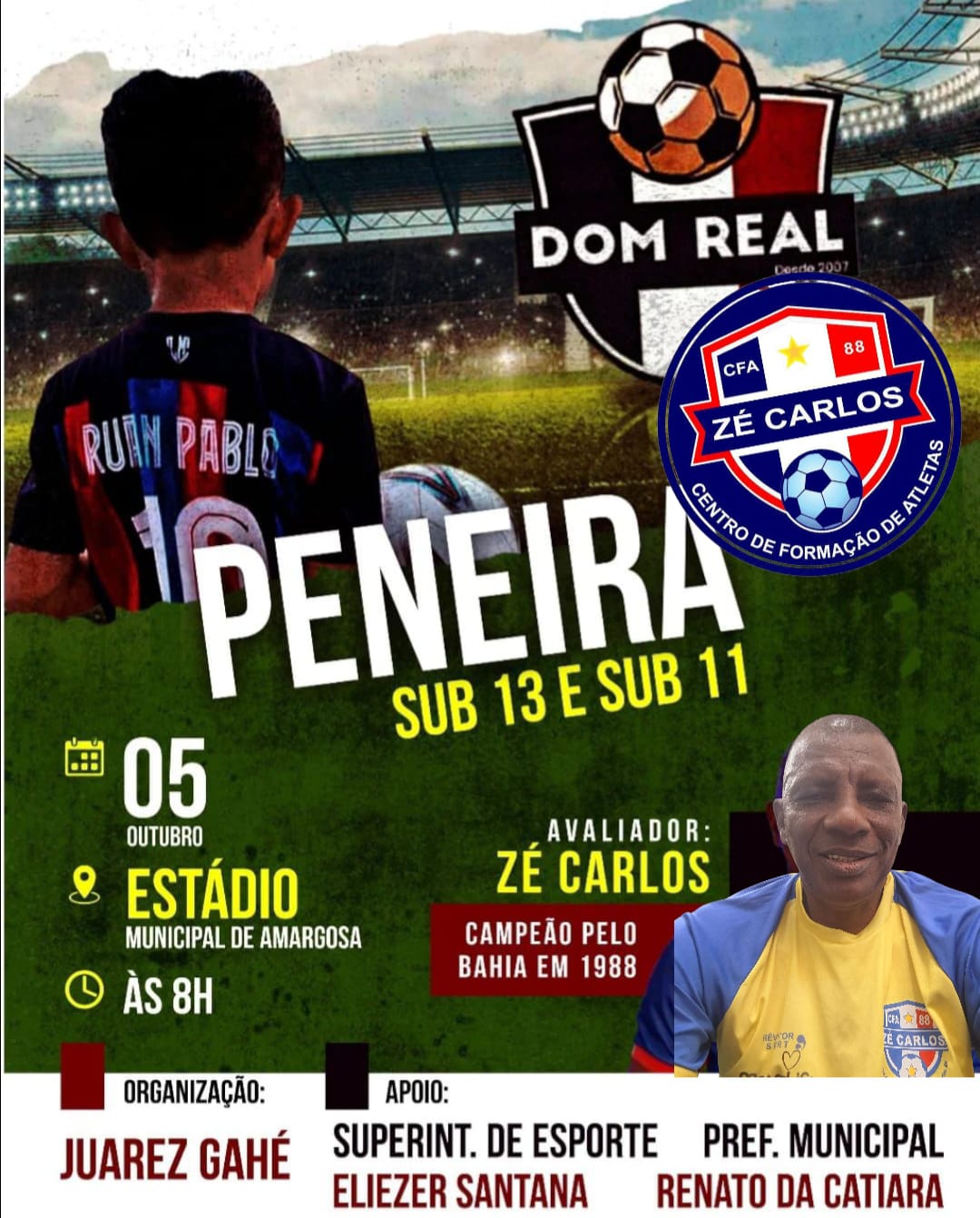 Vem aí, a primeira Peneira de Futebol da Escolinha de Dom Real para crianças de 11 a 14 anos, dia de 05 de outubro, no Estádio Municipal de Amargosa, com a presença do avaliador de futebol de base, Zé Carlos, Campeão Brasileiro em 88 pelo Bahia.