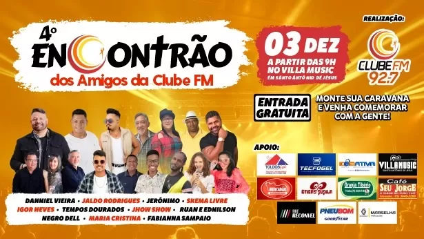 Vem aí o 4º Encontrão dos Amigos da Clube FM – 92,7. O evento faz parte das comemorações dos 44 anos