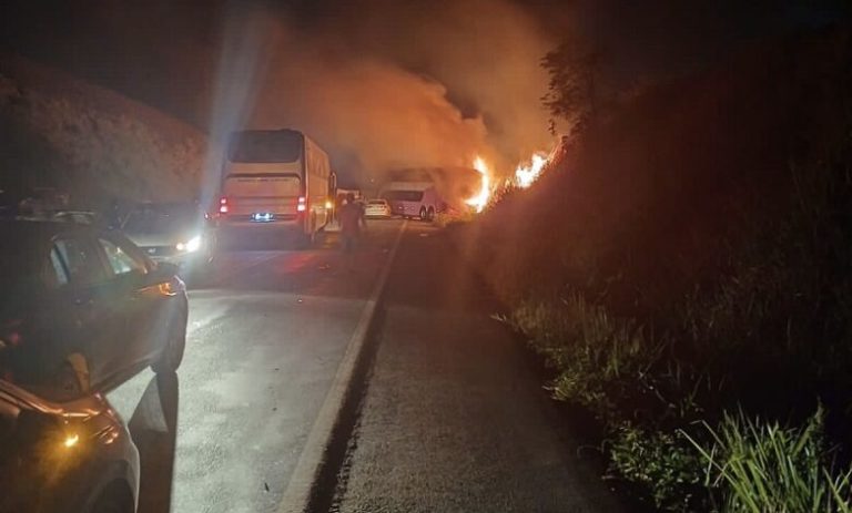 Um ônibus pegou fogo após um acidente colidir frontalmente com carreta na BR-101, próximo à Conceição do Almeida, por volta das
