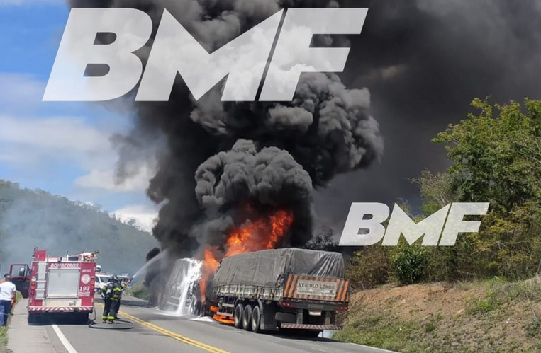 Um incêndio em uma carreta que trafegava pela Rodovia Santos Dumont BR-116 neste domingo (10) provoca a interdição da estrada na