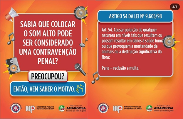 Uma campanha da Polícia Militar, Ministério Público e Prefeitura de Amargosa, alerta a população sobre crime de poluição sonora. Art. 54