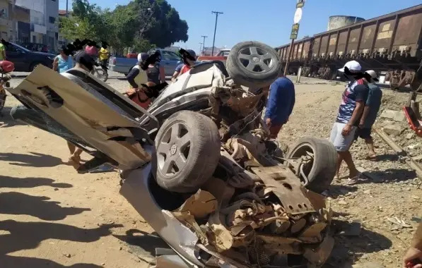 Um carro ficou destruído após ser atingido por um trem no município de Tanhaçu, região Sudoeste da Bahia. O acidente aconteceu por