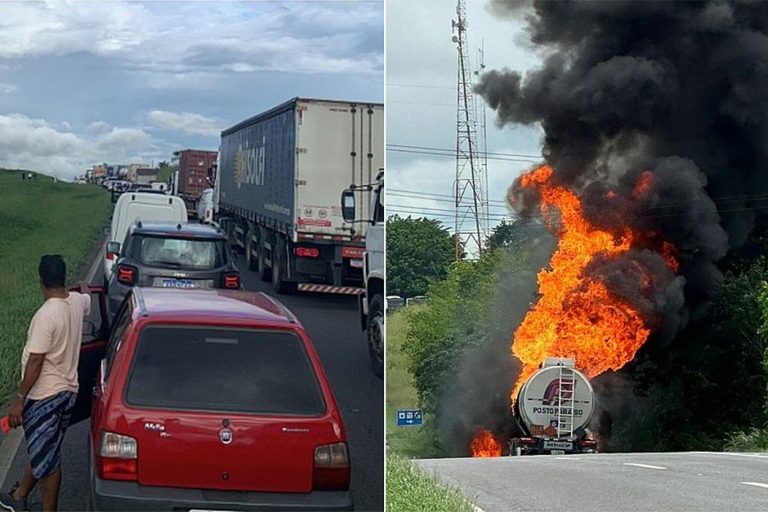 A Polícia Rodoviária Federal (PRF) iniciou, por volta das 19h, a retirada da carga inflamável que estava no caminhão que pegou fogo