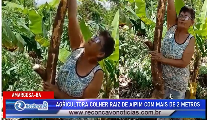 A agricultora Maurina Maia, da cidade de Amargosa, colheu nesta sexta-feira (24), uma raiz de aipim com mais de 2 metros