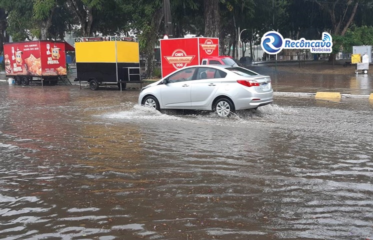 A chuva forte acompanhada de trovões na manhã desta segunda feira (20), deixou a Praça do Bosque mais uma vez alagada.