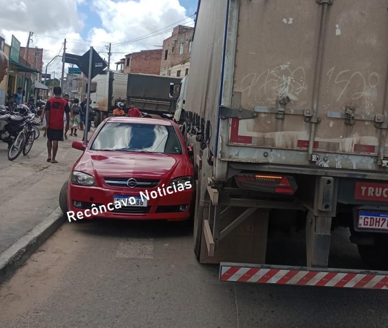 Um veículo Chevrolet Astra ficou prensado após um incidente envolvendo uma carreta, na manhã desta sexta-feira (10), no bairro da Catiara