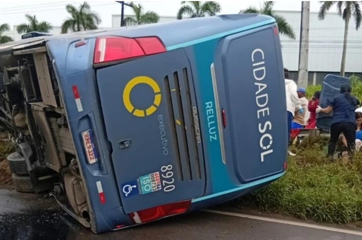 Um ônibus da empresa Cidade Sol tombou no início da tarde desta quinta-feira (4), no km 527 da BR-324, em Feira