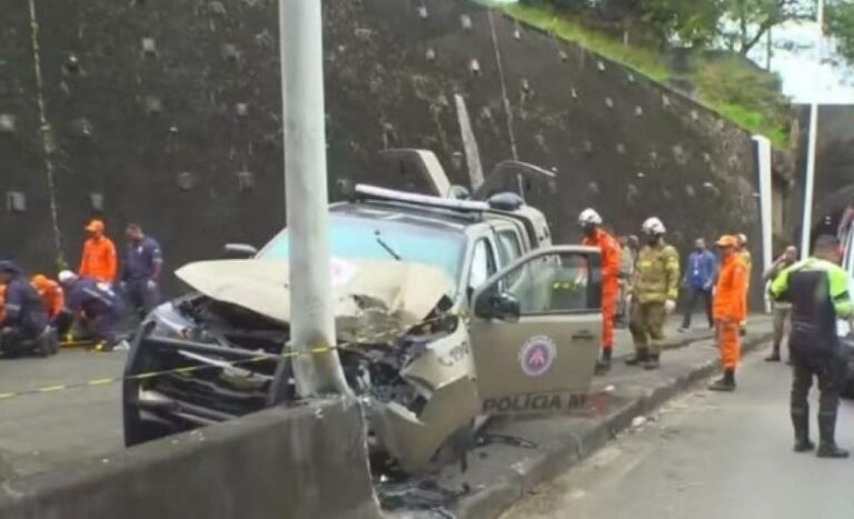 Três policiais militares ficaram feridos após viatura colidir contra um poste na manhã desta quinta-feira (4) em Salvador. Dois deles estão