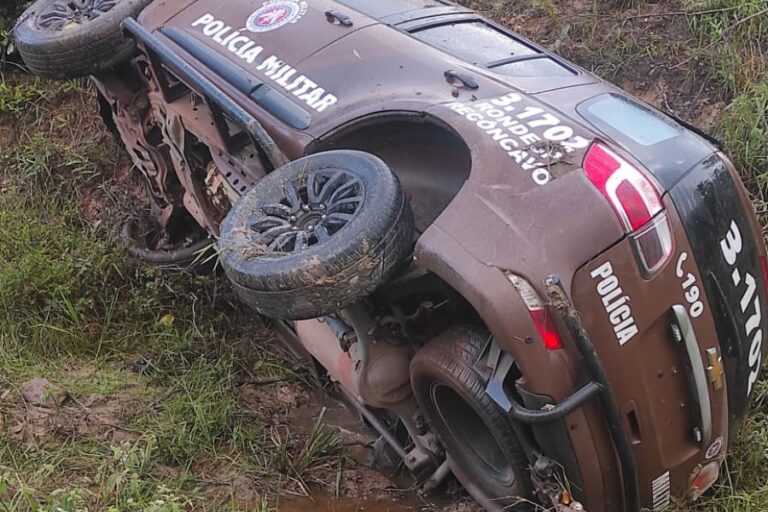Uma viatura da Rondesp Recôncavo capotou e caiu numa vala na madrugada desta quinta-feira (10), na BA-001, trecho próximo à Ponte