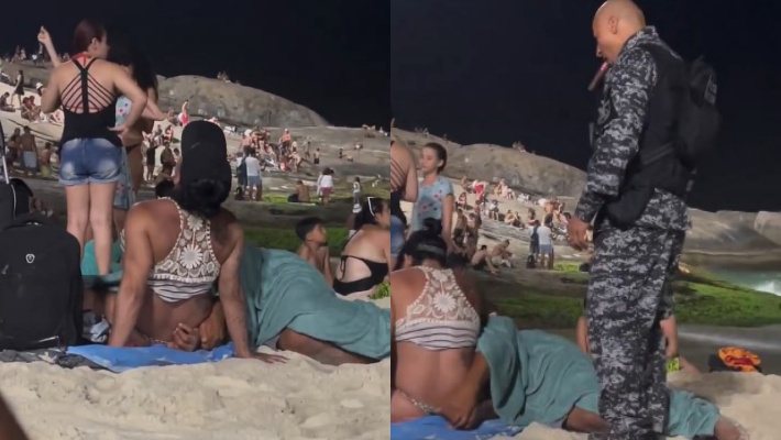 O momento íntimo de um casal, em plena praia movimentada por banhistas, foi interrompido por policiais militares na noite deste domingo