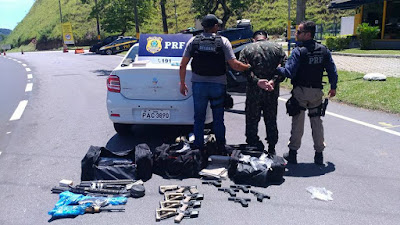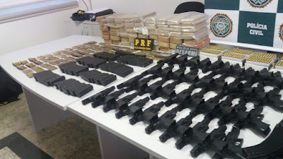 A Polícia Civil e a Polícia Rodoviária Federal apreenderam 19 fuzis, 41 pistolas, carregadores, munição e pasta base de cocaína, na manhã desta quinta-feira, na Via Dutra, altura de Itatiaia, próximo à divisa dos estados do Rio e São Paulo. O material está avaliado em R$ 3 milhões.