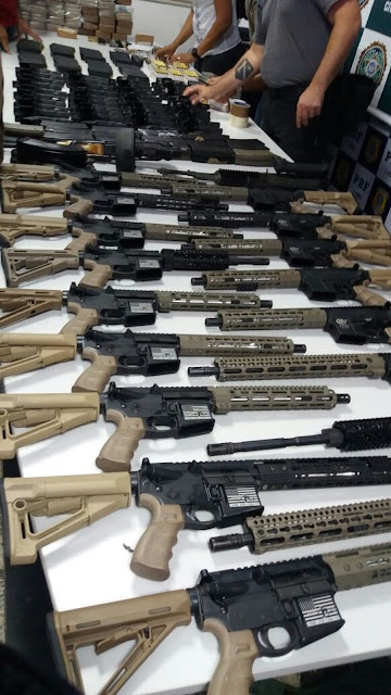Foram apreendidos 17 fuzis AR-15, dois AK-47, 41 pistolas de diversos calibres, 82 carregadores de pistola, 39 carregadores de fuzil, 54 tabletes de pasta base de cocaína e munição ainda não contabilizada.