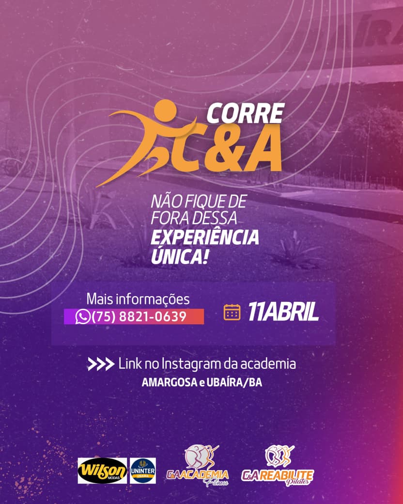 Atenção galera de Amargosa e região, vem aí a 2º CORRE C&A ACADEMIA; dia 11 de abril, com concentração na Praça do Bosque a partir das 17h.